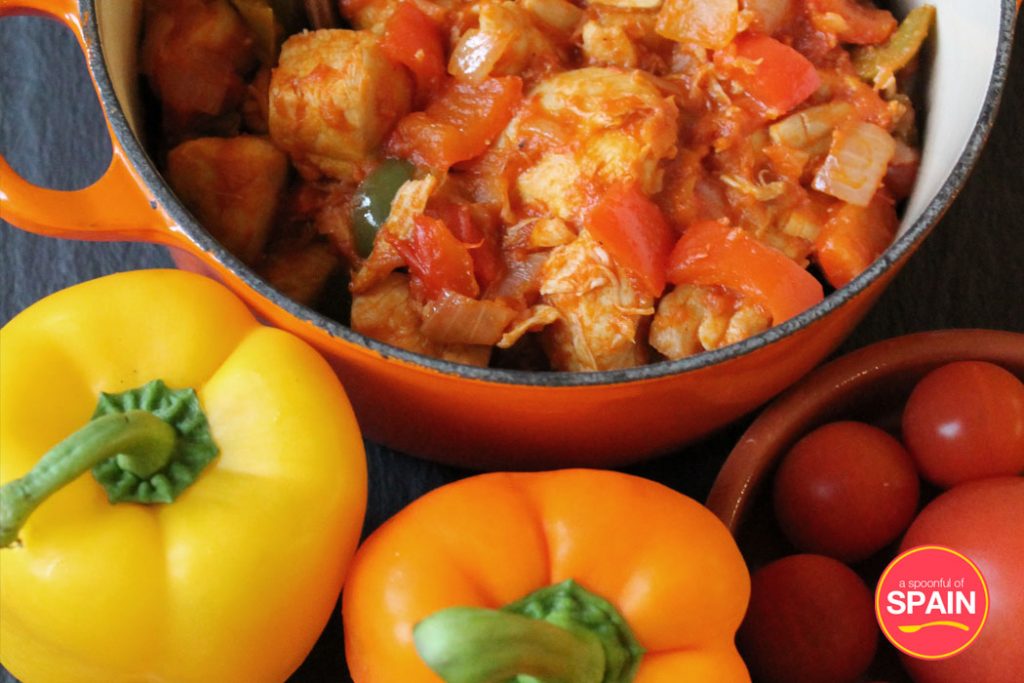 When I was working full-time as an EFL teacher in Madrid, Sevi would prepare lunch for me every day, which I would quickly eat before rushing out the door to my next class. One of my favourite lunches was pollo al chilindrón – chicken stew cooked with peppers and tomatoes. Juicy chunks of bone-in chicken, sweet peppers and a rich chicken broth always helped to set me up for a long afternoon of grammar!